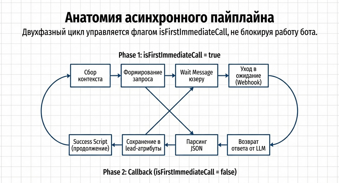 LLM Query — это двухфазный асинхронный компонент.