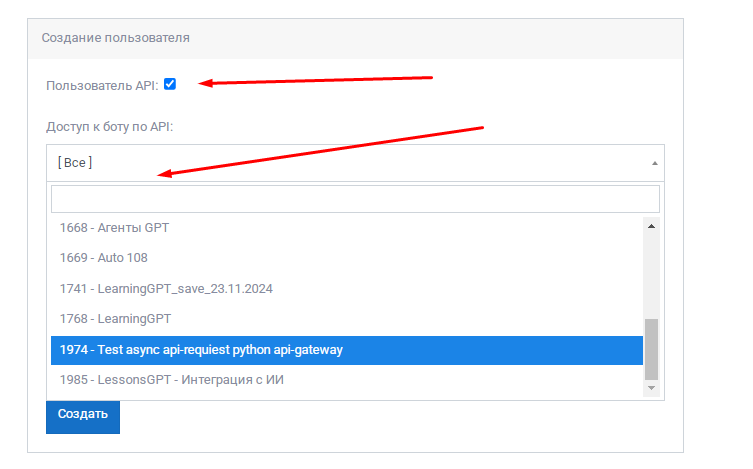 - Установите галочку "Пользователь API"