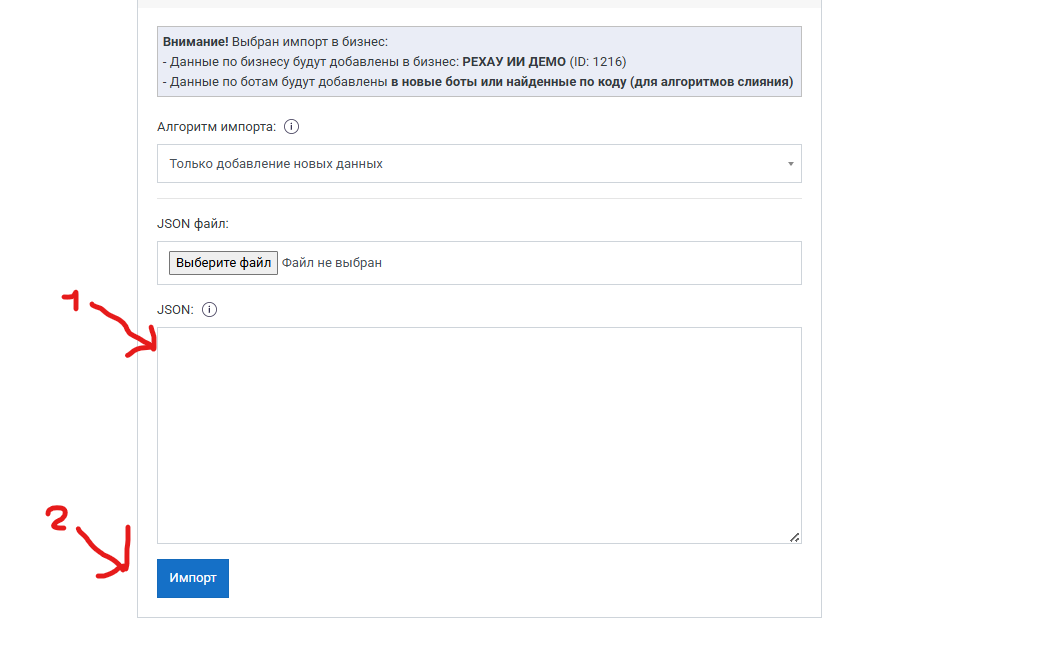 - В интерфейсе Метабот откройте раздел "Импорт бизнеса/ботов"