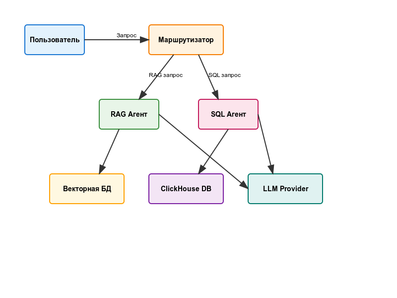 В основе нашей мультиагентной системы лежит Маршрутизатор - это "диспетчер", который анализирует вопрос пользователя и решает, какой именно агент должен его обработать. По умолчанию система использует RAG для поиска информации в базе знаний.