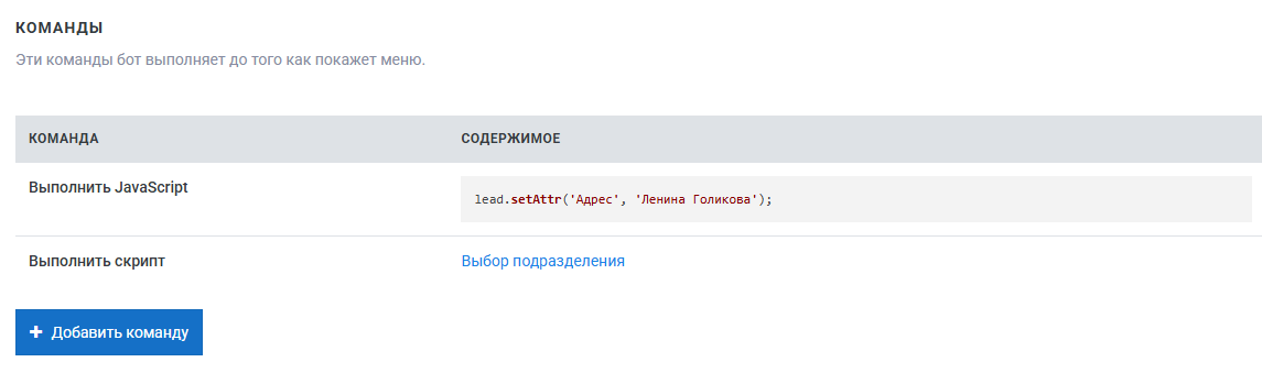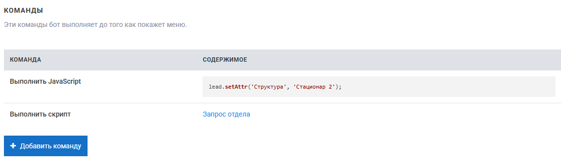 В открывшемся скрипте создайте команды по кнопке Добавить команду: