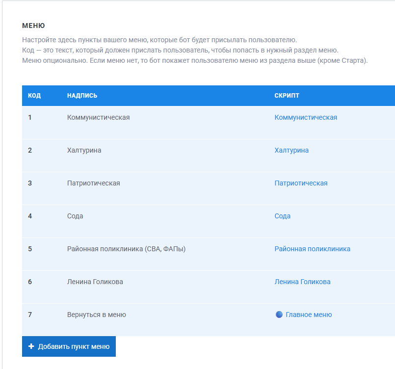 В открывшемся окне заполните Код, ожидаемый в ответе пользователя и Подпись пункта меню. Нажмите Создать.