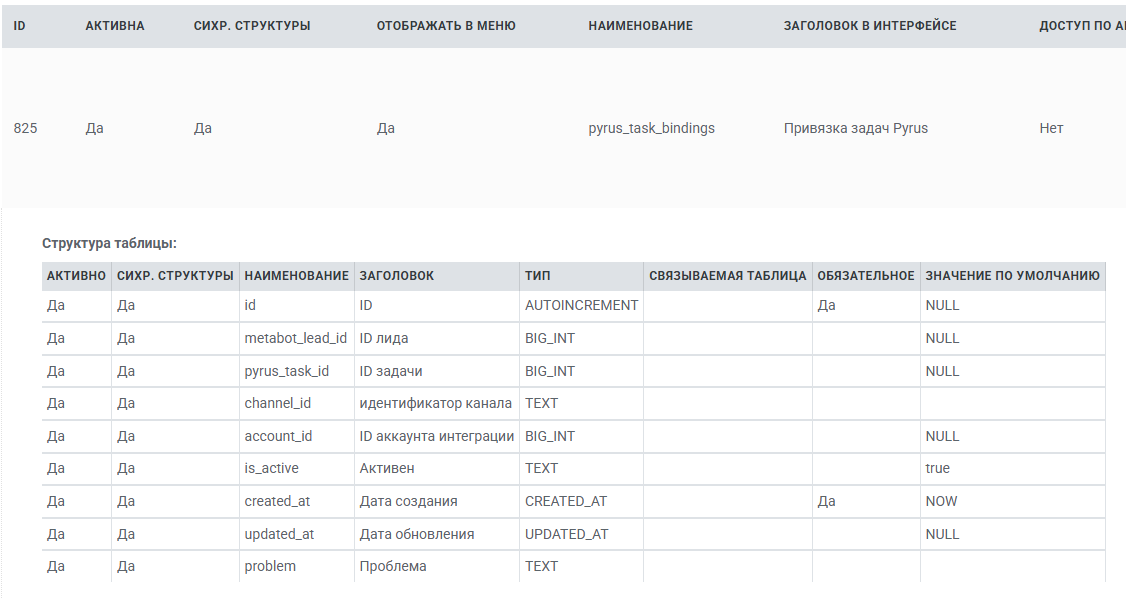 Для работы интеграции в боте необходимо создать таблицу pyrus_task_bindings: